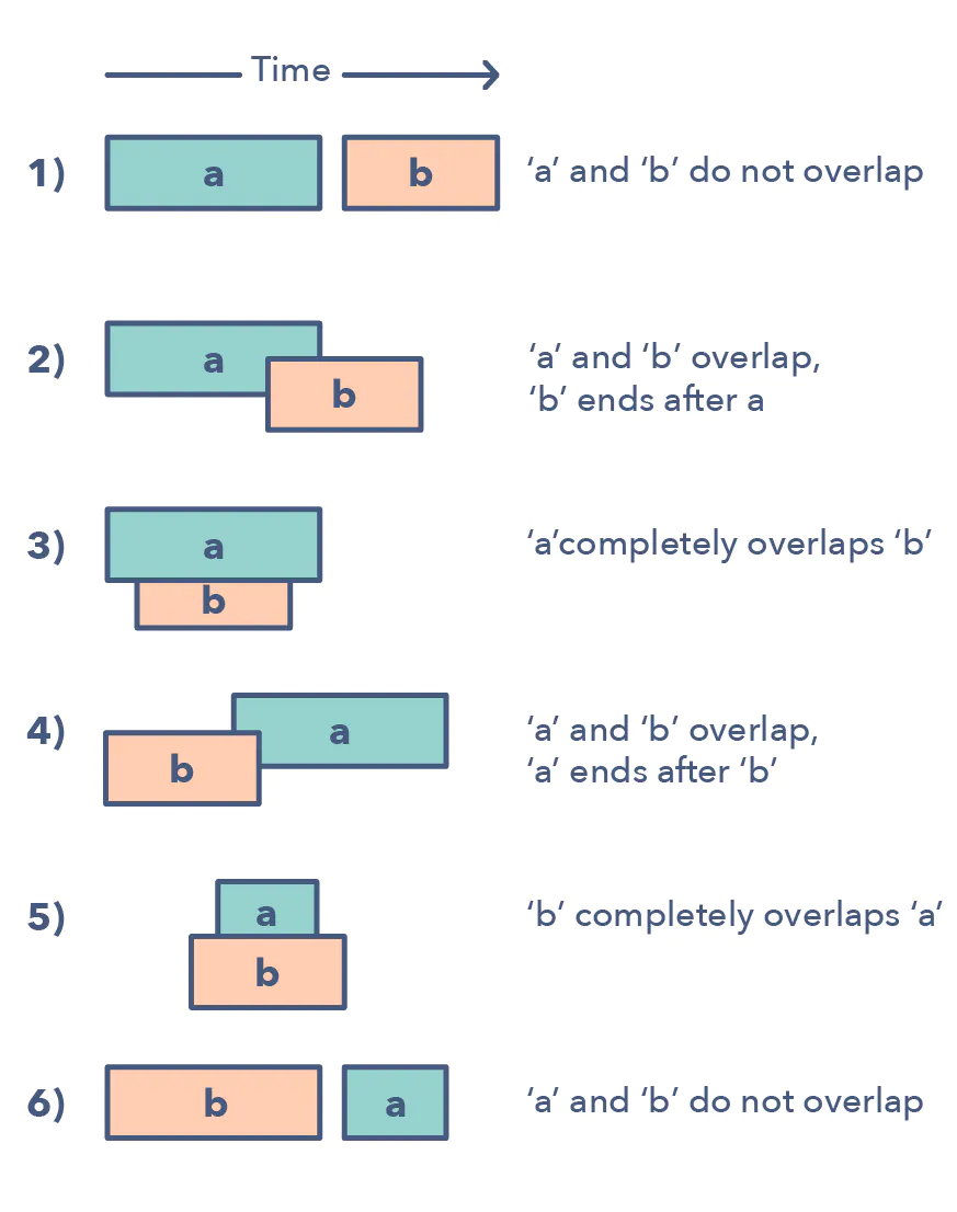 Given two intervals (‘a’ and ‘b’), there will be six different ways the two intervals can relate to each other: